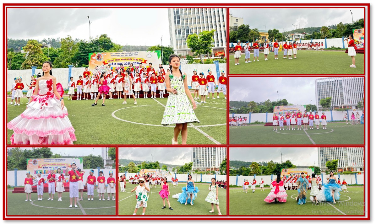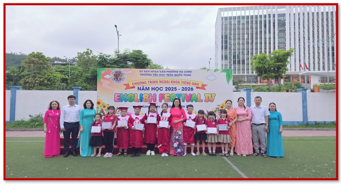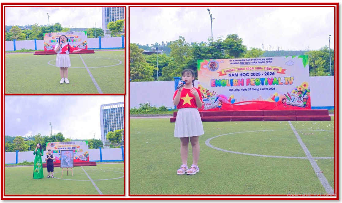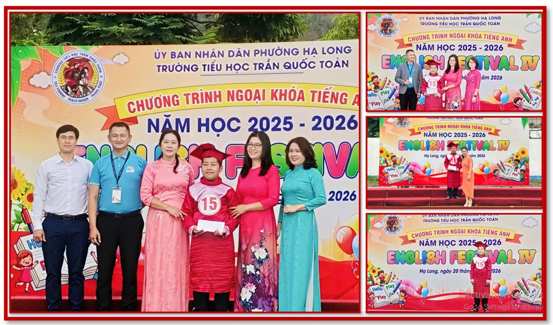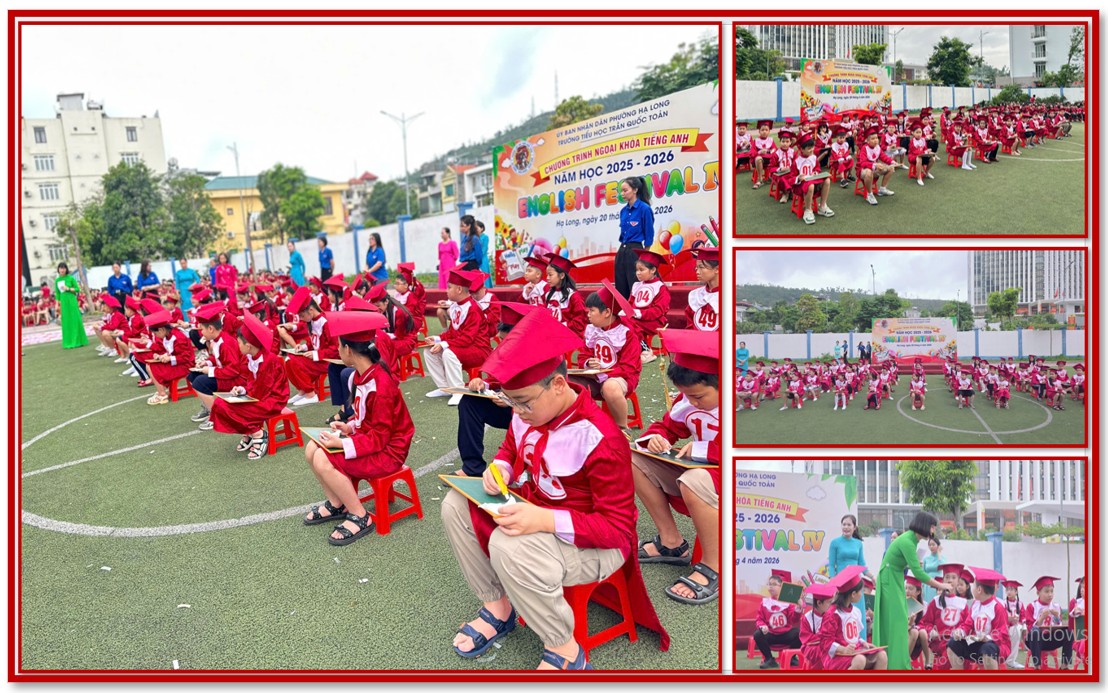 Nằm trong chuỗi hoạt động đổi mới giáo dục và thực hiện nhiệm vụ năm học 2025-2026, sáng ngày 20/4/2026 trường Tiểu học Trần Quốc Toản long trọng tổ chức Ngày hội English Festival lần thứ 4. Đây không chỉ là một sân chơi, mà còn là một sân khấu biểu diễn tài năng cho các thí sinh nhí của trường Tiểu học Trần Quốc Toản. Đến dự chung vui với thầy và trò nhà trường có đồng chí Nhâm Sỹ Thuộc - Phó phòng Văn hóa phường Hạ Long; Bác Ngô Trí Quang - Trưởng ban đại diện cha mẹ học sinh nhà trường; Thầy giáo Michel – Giáo viên của Trung tâm ngoại ngữ Rainbow; Cô giáo Bùi Thị Lan Phương - Hiệu trưởng nhà trường cùng toàn thể các thầy cô giáo và hơn 2000 các em học sinh, các bậc phụ huynh trường Tiểu học Trần Quốc Toản đã về dự đông đủ. ✨ Mục tiêu và Ý nghĩa của Ngày hội English Festival * Nuôi dưỡng tình yêu ngoại ngữ: Tạo môi trường để học sinh thực hành, trau dồi kỹ năng Tiếng Anh thông qua các hoạt động nghe, nói, đọc viết, các trò chơi, bài hát vui nhộn bằng Tiếng Anh. * Rèn luyện bản lĩnh, sự tự tin: Giúp các em học sinh tự tin, mạnh dạn hơn khi đứng trên sân khấu, cách xử lý tình huống trước đám đông. * Gắn kết tình yêu thương: Là cơ hội để các em thể hiện tình cảm với mái trường, thầy cô và bạn bè thông qua ngôn ngữ quốc tế. 🔥 Những màn thi kịch tính và đầy cảm hứng Chương trình diễn ra sôi nổi với 3 nội dung chính, mang lại những cung bậc cảm xúc khác biệt. 1.Talent Contest (Màn chào hỏi & Tài năng): Cuộc tranh tài đầy thú vị giữa hai cơ sở, các đội chơi đã mang đến những tiết mục hát, múa, trình diễn thời trang vô cùng sáng tạo, bắt mắt. Cơ sở 2 thể hiện phần thi màn chào hỏi và tài năng qua điệu nhảy với bài hát “Better When I’m Dancin”. Các bạn học sinh của cơ sở 1 với đôi bàn tay khéo léo, tận dụng từ các nguyên liệu tái chế, các bạn đã tạo ra những bộ thời trang độc đáo mang ý nghĩa bảo vệ thiên nhiên, môi trường và Trái Đất hòa quyện với giọng hát ngọt ngào của 40 thí sinh với bài hát “Dance Monkey” - một ca khúc mang giai điệu tươi vui về tình bạn trong sáng, tình yêu và sự kết nối giữa mọi người trên khắp thế giới.