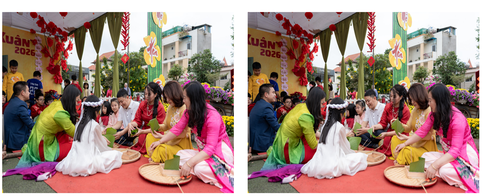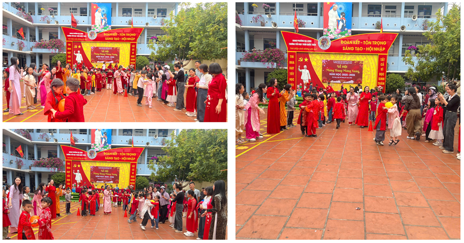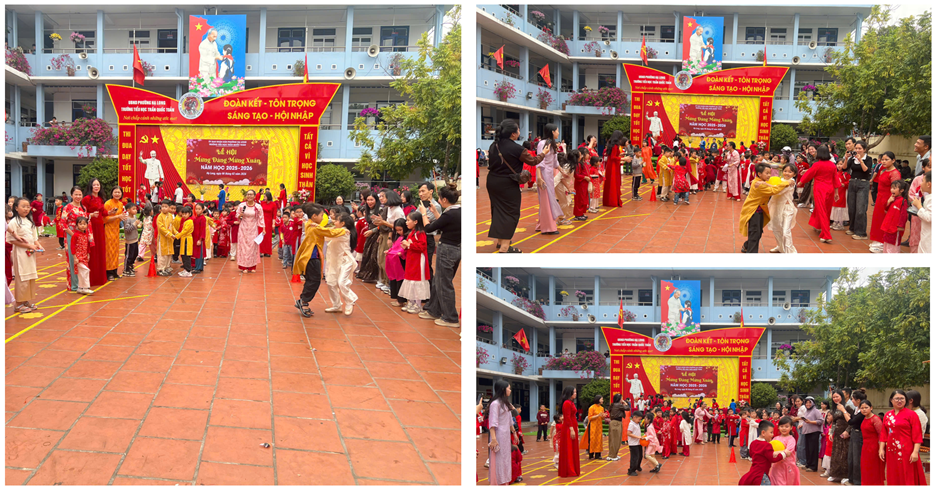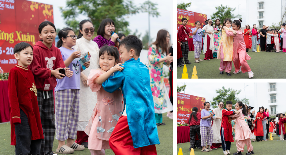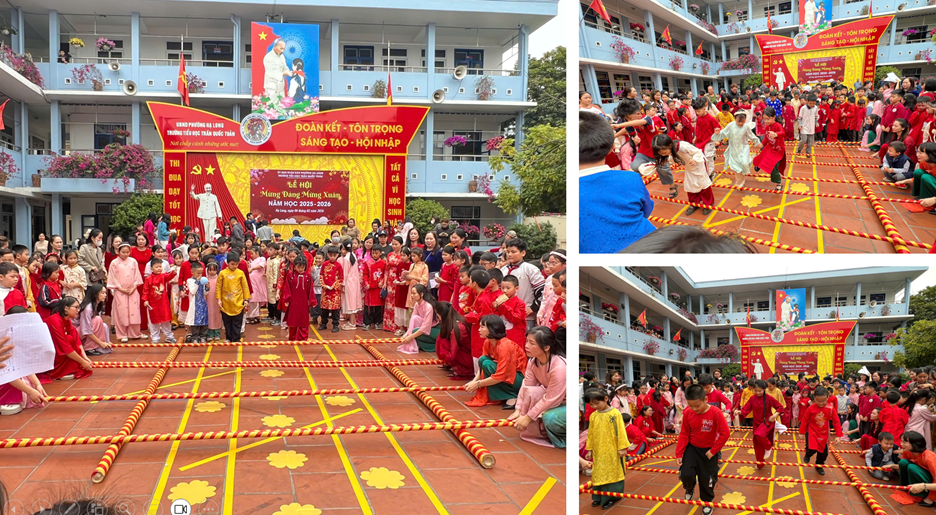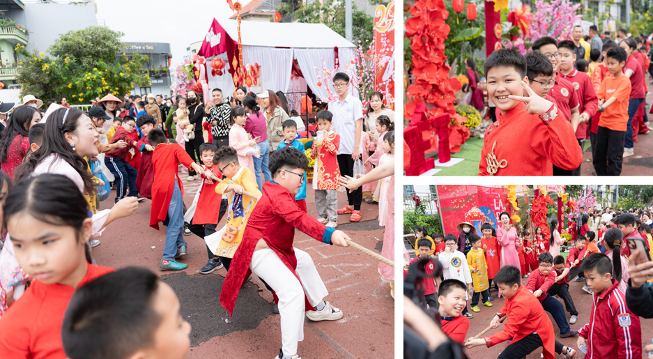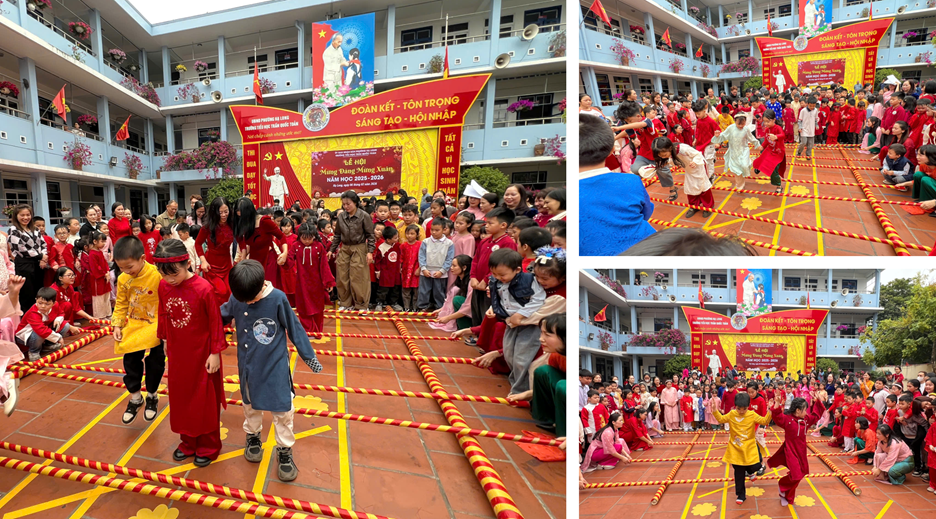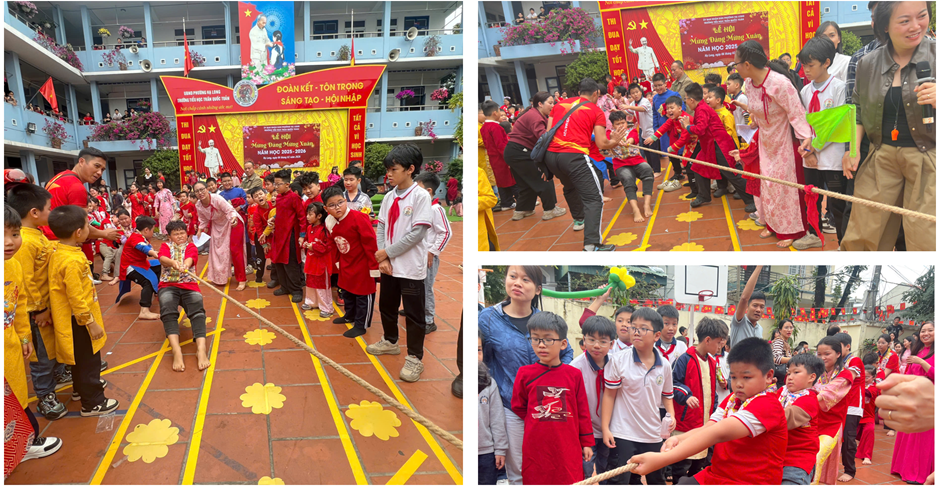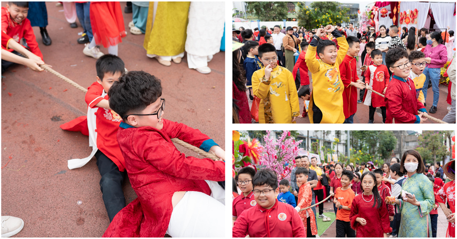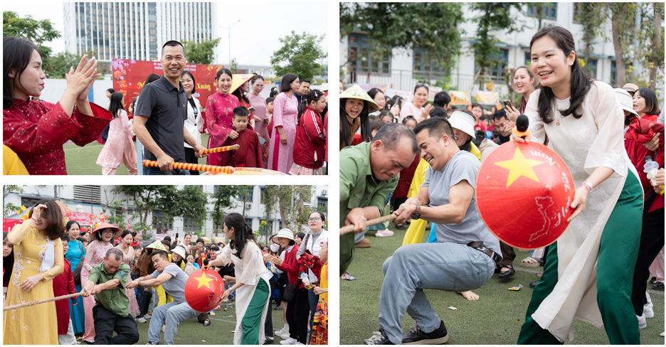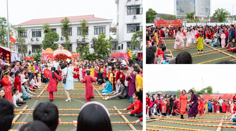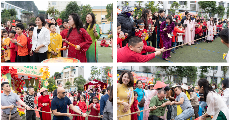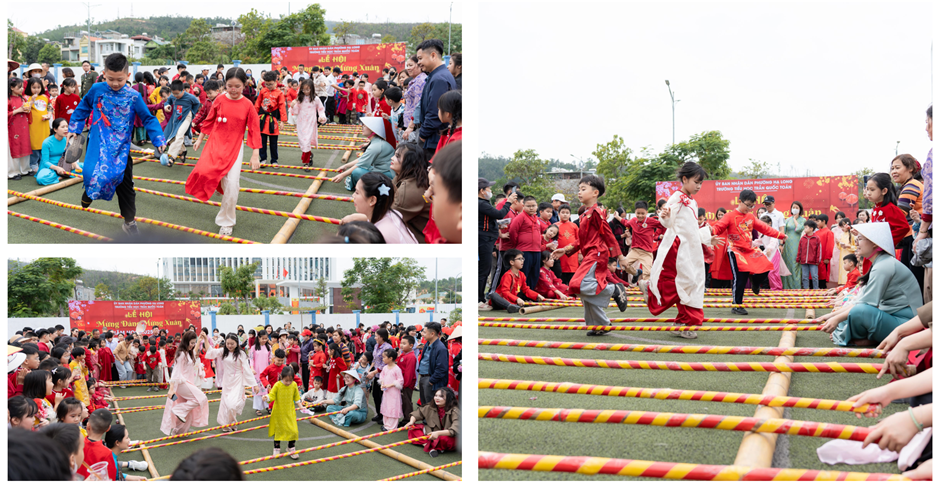 Các trò chơi dân gian nhảy sạp, kéo co, đưa bóng về đích, vòng quay may mắn…. được diễn ra tại vị trí trung tâm của Lễ hội, nơi ấy không còn khoảng cách giữa phụ huynh, học sinh và cô giáo khi tất cả phiên chợ Xuân được cất theo tiếng sạp gọi bạn, từng đôi, từng đôi từ cô giáo và học sinh, cô giáo và phụ hunh, học sinh với học sinh, bố mẹ cùng các con lại cùng nhau chơi hết mình, cùng nhau cất tiếng cười trong trẻo, giòn tan hoà vào không khí của Lễ hội xuân.