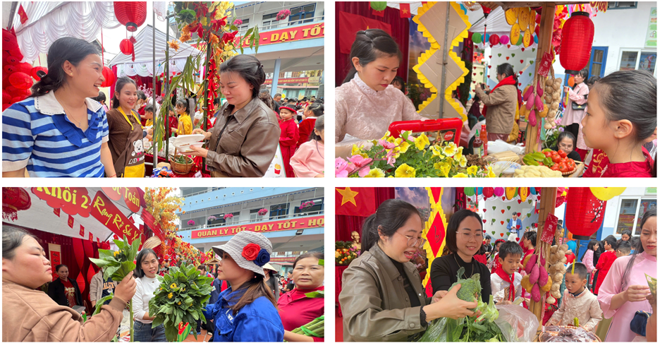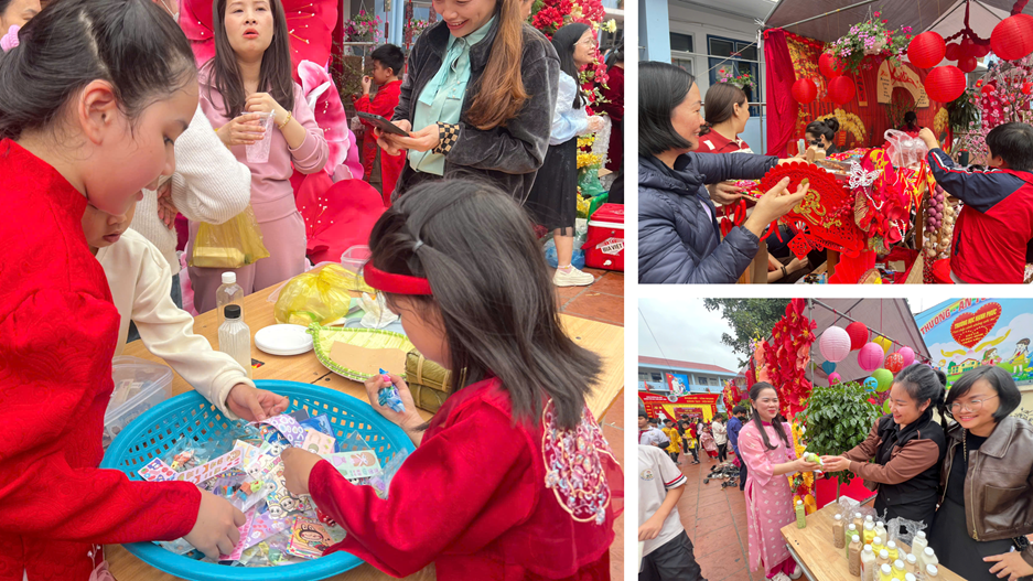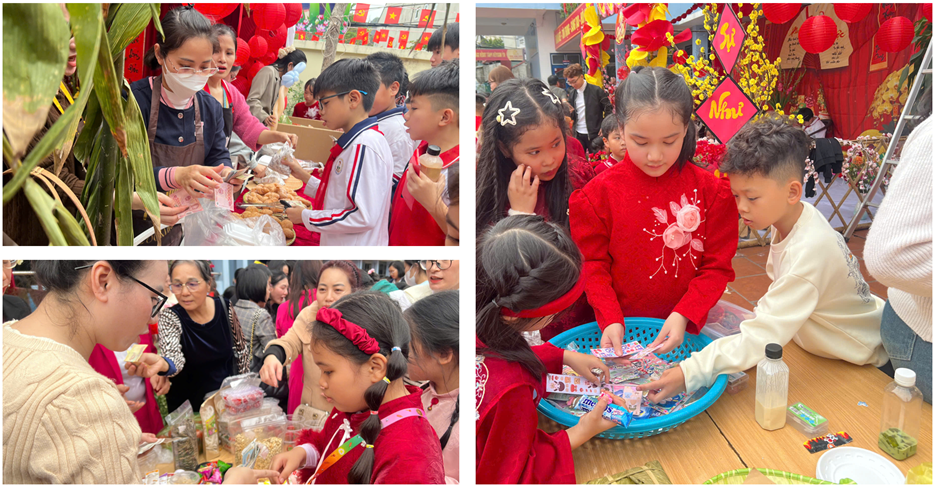 Các gian hàng được trang hoàng rực rỡ Màu của Tết và vô cùng ấm áp, là nơi thưởng thức “Mùi của Tết” với những món ăn vô cùng hấp dẫn về hương vi, món ăn truyền thống, ẩm thực hiện đại, đồ uống siêu cool. Hoạt động trải nghiệm thú vị trò chơi dân gian giải trí và các chương trình văn nghệ đặc sắc như nghệ thuật sáng tạo: tô tượng, sâu vòng, tranh đính hạt, nghệ thuật thư pháp. Hay các sản phẩm Handmade sáng tạo của giáo viên, cha mẹ học sinh và học sinh được làm từ giấy màu, từ sáp nghệ thuật để tạo ra các sản phẩm bắt mắt, nhiều sắc màu nghộ nghĩnh. Đâu đó tại các gian hàng các em học sinh đang tận hưởng thú vui tao nhã cùng ông đồ của khối 4 tạo nên các bức tranh thư pháp mang về làm quà tặng bố mẹ, ông bà, tặng cô giáo thân yêu. Khối 5 độc lạ với trò chơi cờ người, một nét đẹp dân gian được các thầy cô tái hiện trong phiên chợ Xuân Trần Quốc Toản. Phụ huynh tại các gian hàng tận hưởng những ngày Tết xuân đầm ấm bên những phụ huynh của con mình như một gia đình, tiếng trò chuyện, tiếng cười đùa và thưởng thức những món ăn quê hương, ôn lại một kỳ học đã qua của các con với những câu chuyện hài hước và chúc nhau một năm mới an lành. Cùng hoà mình với tiếng gió còn là các câu chào mời rất điêu luyện của các bạn học sinh” cô, bác, chú, anh, chị … ơi mua hàng giúp em, giúp cháu. Tiếng nhẩm đếm tiền thành quả sau khi bán hết hàng của các bạn học sinh vui biết bao… Xuân đã về với mái trường mến yêu của chúng em. Hội chợ quê thật ý nghĩa và thành công rực rỡ, xin được cảm ơn các vị lãnh đạo, cảm ơn các cô các bác, các thầy cô giáo cùng toàn thể phụ huynh và học sinh đã đã góp sức, góp công cùng nhau tạo nên một Lễ hội xuân ấm áp – Tết yêu thương – Rộn ràng chợ quê. Xin kính chúc các thầy cô giáo, cũng như quý phụ huynh, học sinh, một năm mới an khang và hạnh phúc và thịnh vượng.